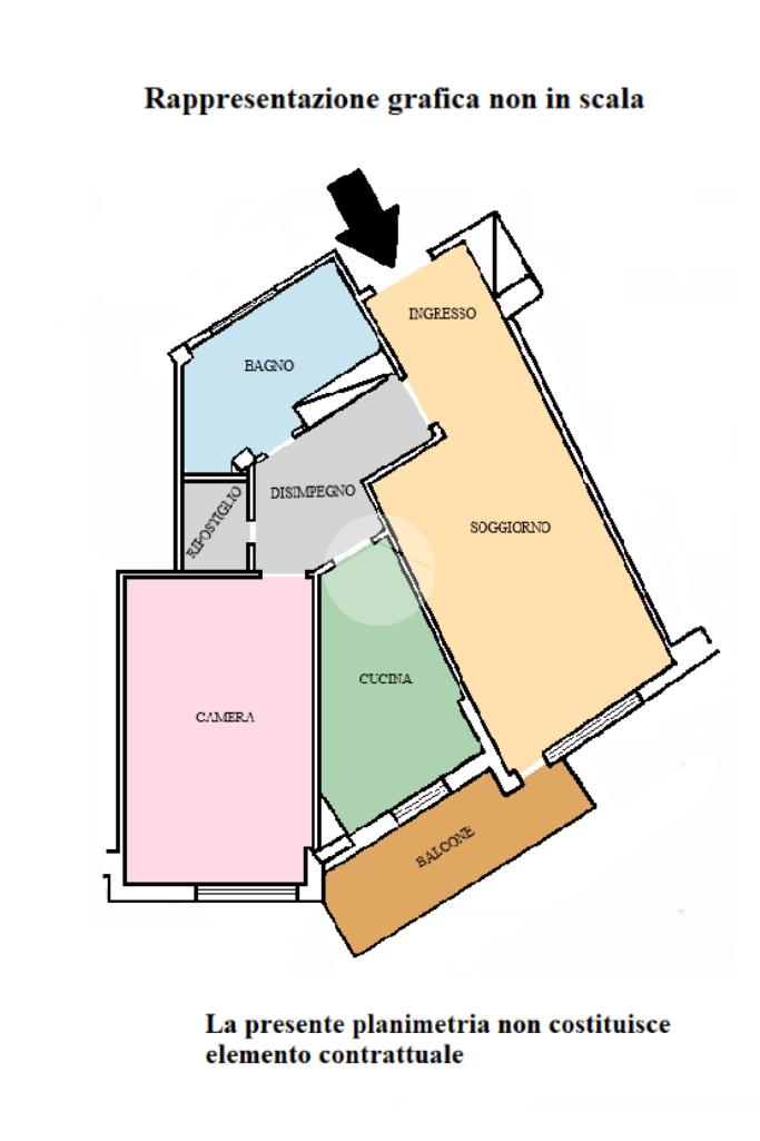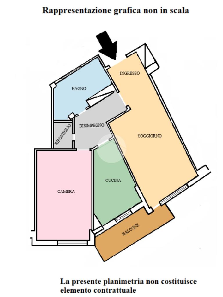 L'immobile internamente è composto da ingresso open-space, ampia zona giorno luminosa con uscita sul balcone esposto a Sud, grande camera da letto finestrata, comoda cucina con uscita sullo stesso balcone che espone a Sud, bagno completo e finestrato ed infine da un utile ripostiglio facilmente trasformabile in un secondo comodo bagno.